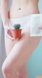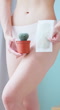 vertical slow motion close up of asian woman holding cactus imply crotch hairy issue and use depilatory wax strip - bikini line hair removal concept