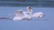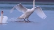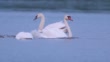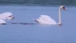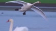 Bird - Mute Swan ( Cygnus olor ) flies over the surface of the water on a cloudy spring early morning. The swan lands on the water. Slow motion.