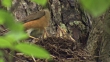 A mother Brown-headed thrush or called Turdus chrysolaus feeding its babies in the nest on the tree