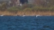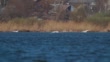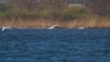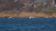 Birds - Mute Swans ( Cygnus olor ) fly over the surface of the water on a sunny spring early morning. Slow motion.