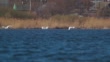 Birds - Mute Swans ( Cygnus olor ) fly over the surface of the water on a sunny spring early morning. - HD stock video