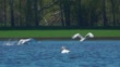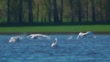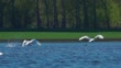 Birds - Mute Swans ( Cygnus olor ) start flying over the surface of the water on a sunny spring early morning. Slow motion.