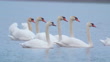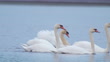 Birds - Mute Swans ( Cygnus olor ) swim in the water on a cloudy spring early morning. - 4K stock video