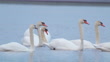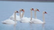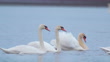 Birds - Mute Swans ( Cygnus olor ) swim in the water on a cloudy spring early morning.