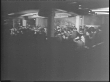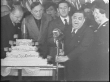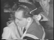 Birthday cake decorated with American flags / crowd of Servicemen lined up outside / close up of servicemen / servicemen walking through front entrance / servicemen waiting on stairs next to Canteen sign / long shot of Canteen interior / Rachel Crothers cuts cake / Roland Young takes bite of cake / Jeanne Cagney and Ralph Bellamy eat cake next to Harry Carey / Fiorello LaGuardia gives speech next to birthday cake / British sailors getting trays of food from window / soldiers getting food in line / servicemen walk through food line / British sailor with beard takes food tray / close up of British sailor smiling / soldier and sailor sitting with woman / African-American soldier and sailor talk with hostess / view of dance floor / serviceman dances with woman, French sailor cuts in, then US Army soldier cuts in / hostess and US sailor jitterbug on platform.