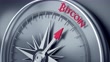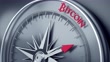 Bitcoin message is in focus on three dimensional realistic compass's needle. High quality image is ready to crop all your social media sizes with copy space.