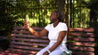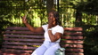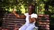 African girl communicates via smartphone with friends on a summer walk in a public park