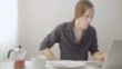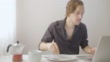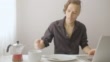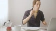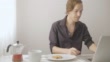 Blond Caucasian Man Eating Toast with Peanut Butter, Drinking Coffee and Looking The Computer on a White Table - 4K stock video