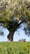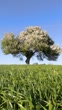 Wild pear tree on the green wheat field. Clear blue sky on background. Viotia, Greece.