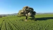 Wild pear tree under clear blue sky on the green wheat field. Aerial view. Viotia, Greece.