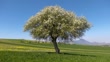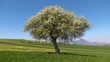Wild pear tree on the green wheat field under clear blue sky. Viotia, Greece.
