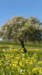 Wild pear tree on the green wheat field under clear blue sky. Viotia, Greece.
