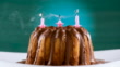 Blowing out (twice) pink birthday candles on marble cake with chocolate nougat icing