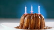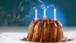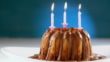 Blowing out pink birthday candles on marble cake with chocolate nougat icing