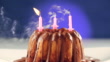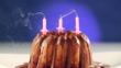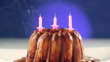 Blown out birthday candles lighting by itself again on marble cake with chocolate nougat icing