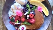 Horizontal still life close up of healthy breakfast of organic blueberry avocado pancakes with blueberry compote maple syrup activated nuts of macadamia and walnut kiwi fruit banana strawberries coconut icecream edible flowers with a mango smoothie with raw buckwheat