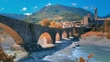View from the hunchback bridge of the historic village of Bobbio. The town was voted in 2020 as the most beautiful village in Italy. The bridge in the foreground is an ancient Roman stone construction. Italian Wallpapers.