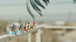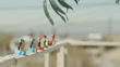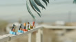 Bobblehead figures lined up along a fence, the figures include mice with drums, the leaves of a palm tree blow above in the wind, Salton Sea, California (FKAD628B - Clip taken from programme rushes - 333938)
