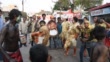 AMRAVATI, MAHARASHTRA, INDIA September 27, 2017 : Group of body painted people perform tiger dance at street of city, Tiger dance is a traditional item performed during dussera festival.