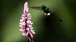 Booted racket tail hummingbird (Ocreatus underwoodii) approaches flowers, Ecuador - 4K stock video