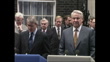 Boris Yeltsin UK visit; ENGLAND: London: Westminster: Downing Street:EXTBank of press waiting outside No 10. Boris Yeltsin (Russian President) and John Major MP (Prime Minister) out of No 10 walks up to lectern and speaks to press and announces ten point plan - Norman Lamont MP (Chancellor), Douglas Hurd MP (Foreign Secretary), Boris Pankin (Russian Ambassador to Britain), Yevgeny Shaposhnikov (CIS commander in chief), Yegor Gaidar (Russian Finance Minister) and others in background