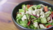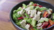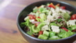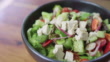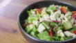 Bowl of greek salad rotating smoothly over wooden table