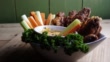 A delicious bowl o Keto hot wings served with a cup of hot sauce, carrot and celery sticks garnished with parsley