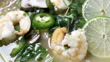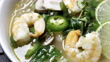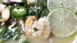 A Bowl Of Shrimp Pho Soup With Green Onion, Mushrooms, Fresh Garlic, Bok Choy, Jalapeno, Lemon Slices And Cilantro Over Pad Thai Noodles, Close Up video