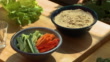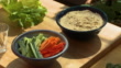 Steady, medium close up shot of a bowl of vegetables and a bowl of grains.