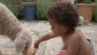 SLO MO MS CU Baby boy (18-23 months) feeding Bedlington Terrier outdoors / Dinton, Wiltshire, UK
