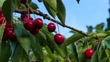 Close-up of branches with ripe cherries and green leaves