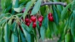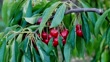 Close-up of branches with ripe cherries and green leaves