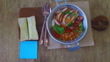 Video of break fast on table top view. Blue Post-it. 4K