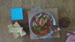 Video of break fast on table top view. Blue Post-it. Hand woman eating. 4K