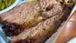 This clip features a handsome portion of slightly marbled brisket at a BBQ (barbeque) restaurant in Roanoke, Virginia. A side of green beans is also visible.