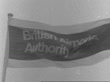 Aviation: British Airports Authority takes over control of Heathrow, Gatwick, Stanstead and Prestwick; ENGLAND: London: Gatwick:EXTMS Pan up pole as flag unfurled by the Chairman of the Authority, Peter MasefieldBV Man looking up at 'British Airports Authority' flag, which is blue and white