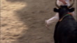 A bull with a banderilla stuck in its back chases a young man out of a bullring.