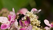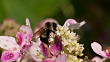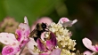 Affinis bumble bee forages on hydrangea flowers in nice light