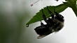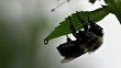 A bumble bee hold onto a green leaf with a dewdrop, high speed closeup