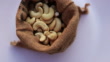 Cashew filled in burlap sack bag isolated on white background table top spin.