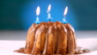 Burning blue birthday candles on marble cake with chocolate nougat icing