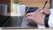 Businessman doing work on his computer while sitting at laptop in home office. Manager browses web and takes notes while working on projects. Selective focus technique with office background side view