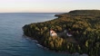 Aerial views of the lighthouse at Cabot Head Provincial Nature Reserve near of the coastline near Bruce Peninsula National Park.