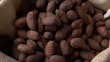 Roasted cacao beans slowly flew from human hands into a bag that almost full of cacao beans, studio shot, closeup shot.