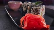 California rolls on a board with a ginger pieces and soy sauce bowl- close up - 4K stock video