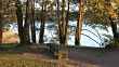 Calm scene with park bench and lake. LOOP - HD stock video