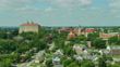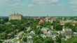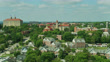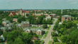 Aerial establishing shot of the campus of the University of Kansas in Lawrence on a sunny day in summer.