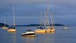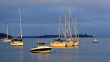 Canada Mahone Bay Nova Scotia marina harbor at sunset with glow from sun on boats small village in relaxing tourist town