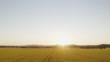 Drone flies directly above oil seed crop, slowly panning up to take in surrounding farmland at day's end
