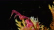 Caprella skeleton shrimp. Close-up of a skeleton shrimp (Caprella sp.) waiting to catch its prey. Skeleton shrimp mimic the colour and shape of the fronds of seaweed, hydroids and bryozoans amongst which they live. They use this camouflage to help ambush their prey. Filmed in the Russian Arctic, in the White Sea